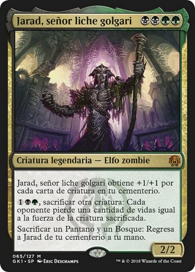 | Rules | Jarad, Golgari Lich Lord gets +1/+1 for each creature card in your graveyard. , Sacrifice another creature: Each opponent loses life equal to the sacrificed creature's power. Sacrifice a Swamp and a Forest: Return Jarad from your graveyard to your hand. |