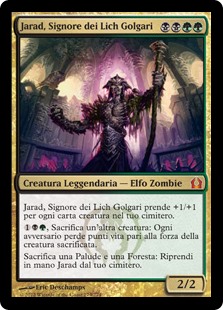 | Rules | Jarad, Golgari Lich Lord gets +1/+1 for each creature card in your graveyard. , Sacrifice another creature: Each opponent loses life equal to the sacrificed creature's power. Sacrifice a Swamp and a Forest: Return Jarad from your graveyard to your hand. |