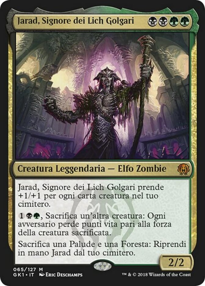 | Rules | Jarad, Golgari Lich Lord gets +1/+1 for each creature card in your graveyard. , Sacrifice another creature: Each opponent loses life equal to the sacrificed creature's power. Sacrifice a Swamp and a Forest: Return Jarad from your graveyard to your hand. |