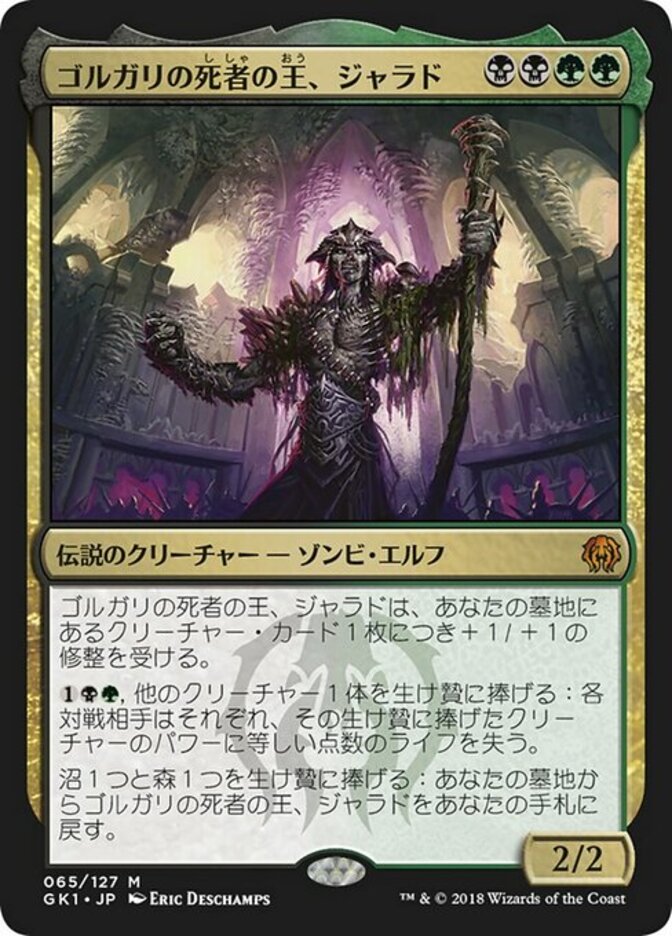 | Rules | Jarad, Golgari Lich Lord gets +1/+1 for each creature card in your graveyard. , Sacrifice another creature: Each opponent loses life equal to the sacrificed creature's power. Sacrifice a Swamp and a Forest: Return Jarad from your graveyard to your hand. |
