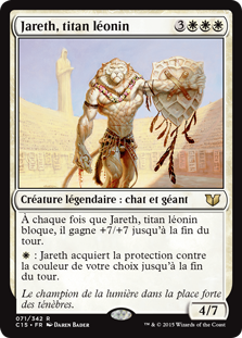 | Rules | Whenever Jareth, Leonine Titan blocks, it gets +7/+7 until end of turn. : Jareth gains protection from the color of your choice until end of turn. |