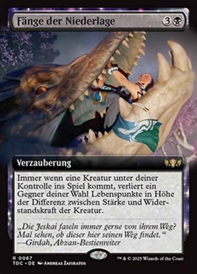 | Rules | Whenever a creature you control enters, target opponent loses life equal to the difference between that creature's power and its toughness. |