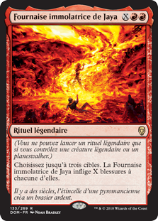 | Rules | (You may cast a legendary sorcery only if you control a legendary creature or planeswalker.) Jaya's Immolating Inferno deals X damage to each of up to three targets. |