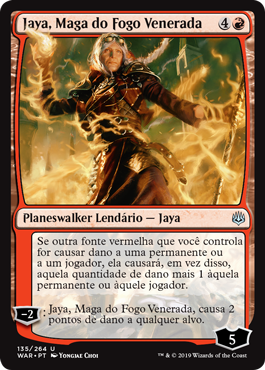 | Rules | If another red source you control would deal damage to a permanent or player, it deals that much damage plus 1 to that permanent or player instead. −2: Jaya, Venerated Firemage deals 2 damage to any target. |