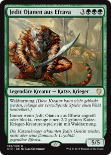 | Rules | Forestwalk (This creature can't be blocked as long as defending player controls a Forest.) Whenever Jedit Ojanen of Efrava attacks or blocks, create a 2/2 green Cat Warrior creature token with forestwalk. |