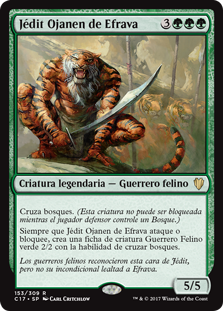 | Rules | Forestwalk (This creature can't be blocked as long as defending player controls a Forest.) Whenever Jedit Ojanen of Efrava attacks or blocks, create a 2/2 green Cat Warrior creature token with forestwalk. |