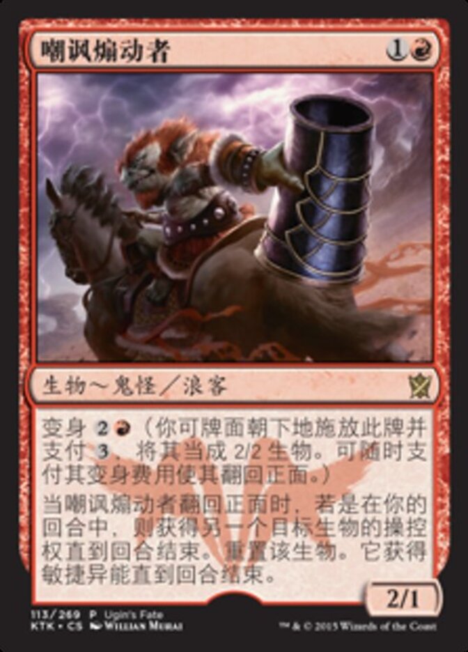 | Rules | Morph (You may cast this card face down as a 2/2 creature for . Turn it face up any time for its morph cost.) When Jeering Instigator is turned face up, if it's your turn, gain control of another target creature until end of turn. Untap that creature. It gains haste until end of turn. |