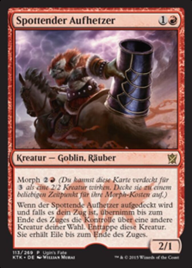 | Rules | Morph (You may cast this card face down as a 2/2 creature for . Turn it face up any time for its morph cost.) When Jeering Instigator is turned face up, if it's your turn, gain control of another target creature until end of turn. Untap that creature. It gains haste until end of turn. |