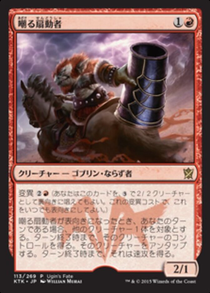 | Rules | Morph (You may cast this card face down as a 2/2 creature for . Turn it face up any time for its morph cost.) When Jeering Instigator is turned face up, if it's your turn, gain control of another target creature until end of turn. Untap that creature. It gains haste until end of turn. |