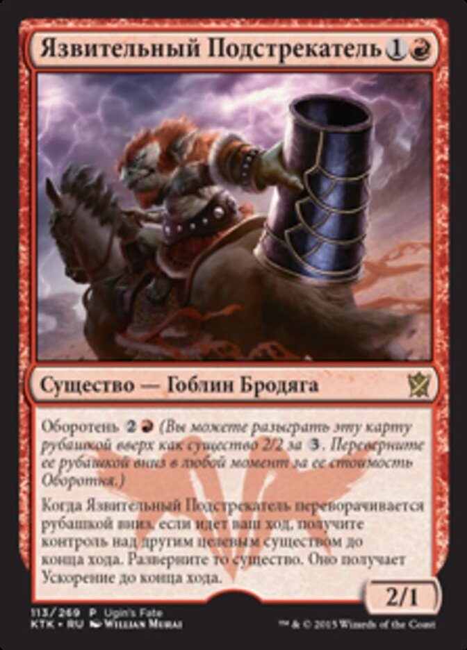 | Rules | Morph (You may cast this card face down as a 2/2 creature for . Turn it face up any time for its morph cost.) When Jeering Instigator is turned face up, if it's your turn, gain control of another target creature until end of turn. Untap that creature. It gains haste until end of turn. |