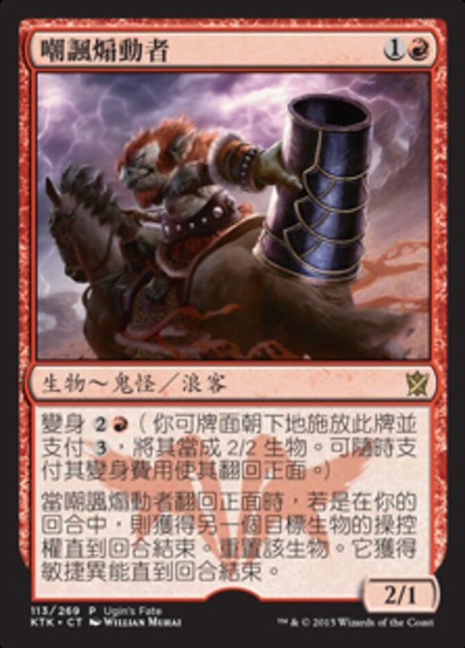 | Rules | Morph (You may cast this card face down as a 2/2 creature for . Turn it face up any time for its morph cost.) When Jeering Instigator is turned face up, if it's your turn, gain control of another target creature until end of turn. Untap that creature. It gains haste until end of turn. |