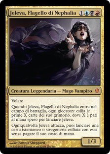 | Rules | Flying When Jeleva, Nephalia's Scourge enters the battlefield, each player exiles the top X cards of their library, where X is the amount of mana spent to cast Jeleva. Whenever Jeleva attacks, you may cast an instant or sorcery spell from among cards exiled with Jeleva without paying its mana cost. |