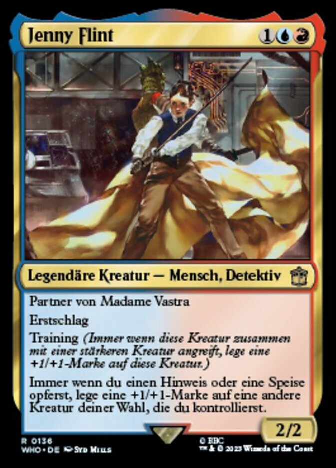 | Rules | Partner with Madame Vastra First strike Training (Whenever this creature attacks with another creature with greater power, put a +1/+1 counter on this creature.) Whenever you sacrifice a Clue or Food, put a +1/+1 counter on another target creature you control. |