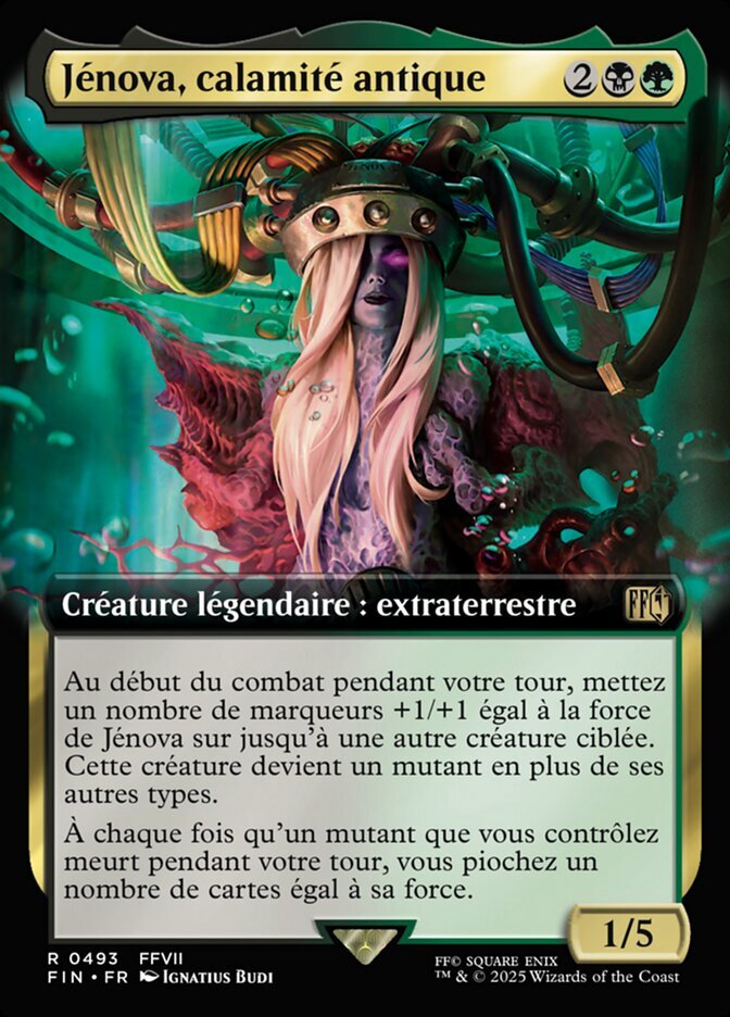 | Rules | At the beginning of combat on your turn, put a number of +1/+1 counters equal to Jenova's power on up to one other target creature. That creature becomes a Mutant in addition to its other types. Whenever a Mutant you control dies during your turn, you draw cards equal to its power. |