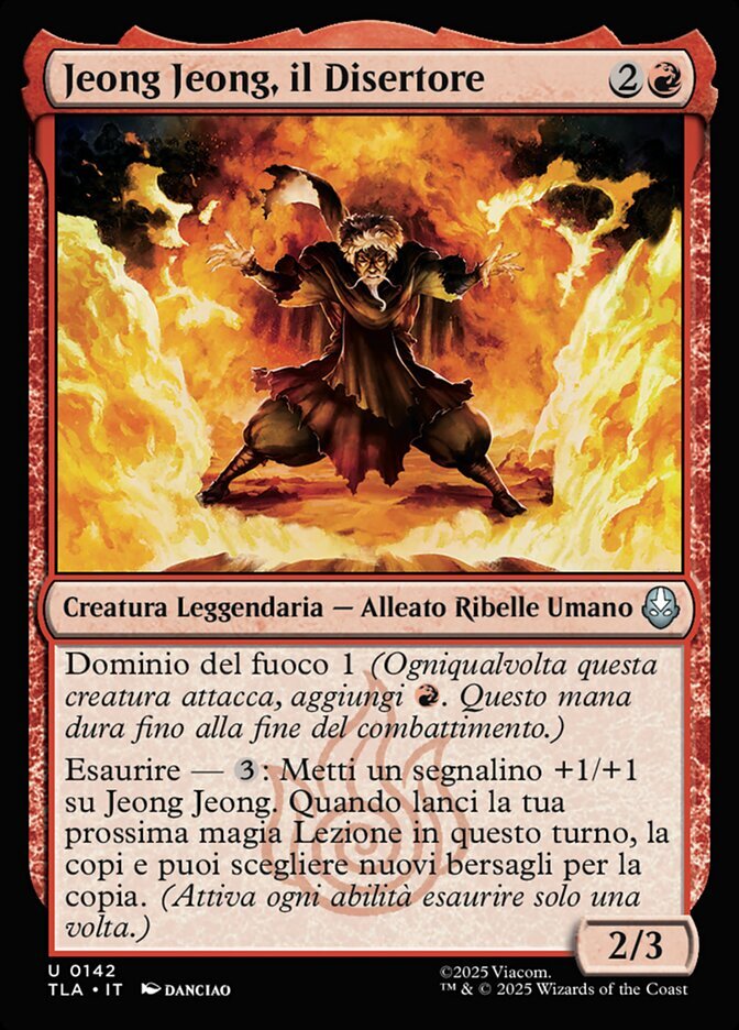 | Rules | Firebending 1 (Whenever this creature attacks, add . This mana lasts until end of combat.) Exhaust — : Put a +1/+1 counter on Jeong Jeong. When you next cast a Lesson spell this turn, copy it and you may choose new targets for the copy. |