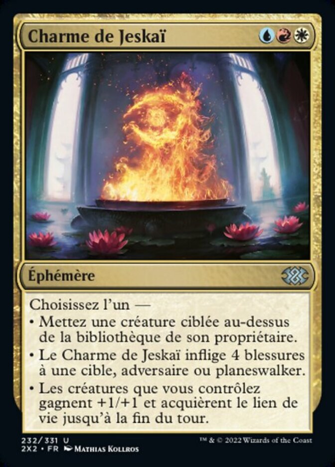 | Rules | Choose one — • Put target creature on top of its owner's library. • Jeskai Charm deals 4 damage to target opponent or planeswalker. • Creatures you control get +1/+1 and gain lifelink until end of turn. |