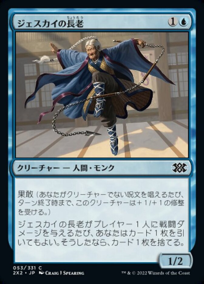 | Rules | Prowess (Whenever you cast a noncreature spell, this creature gets +1/+1 until end of turn.) Whenever Jeskai Elder deals combat damage to a player, you may draw a card. If you do, discard a card. |