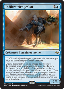 | Rules | Jeskai Infiltrator can't be blocked as long as you control no other creatures. When Jeskai Infiltrator deals combat damage to a player, exile it and the top card of your library in a face-down pile, shuffle that pile, then manifest those cards. (To manifest a card, put it onto the battlefield face down as a 2/2 creature. Turn it face up any time for its mana cost if it's a creature card.) |