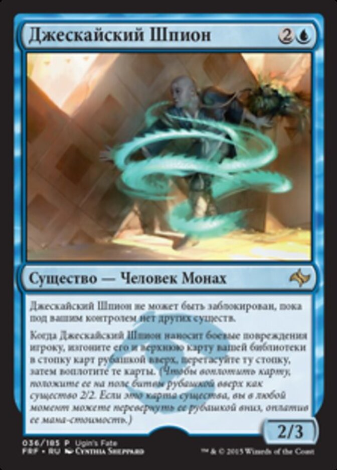 | Rules | Jeskai Infiltrator can't be blocked as long as you control no other creatures. When Jeskai Infiltrator deals combat damage to a player, exile it and the top card of your library in a face-down pile, shuffle that pile, then manifest those cards. (To manifest a card, put it onto the battlefield face down as a 2/2 creature. Turn it face up any time for its mana cost if it's a creature card.) |