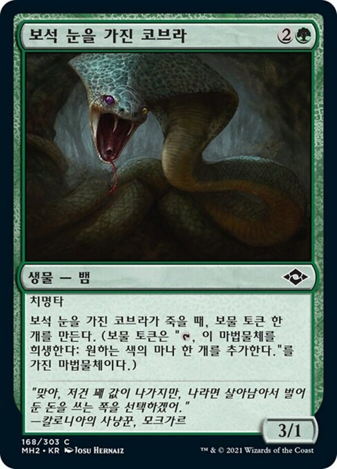 | Rules | Deathtouch When Jewel-Eyed Cobra dies, create a Treasure token. (It's an artifact with ", Sacrifice this artifact: Add one mana of any color.") |