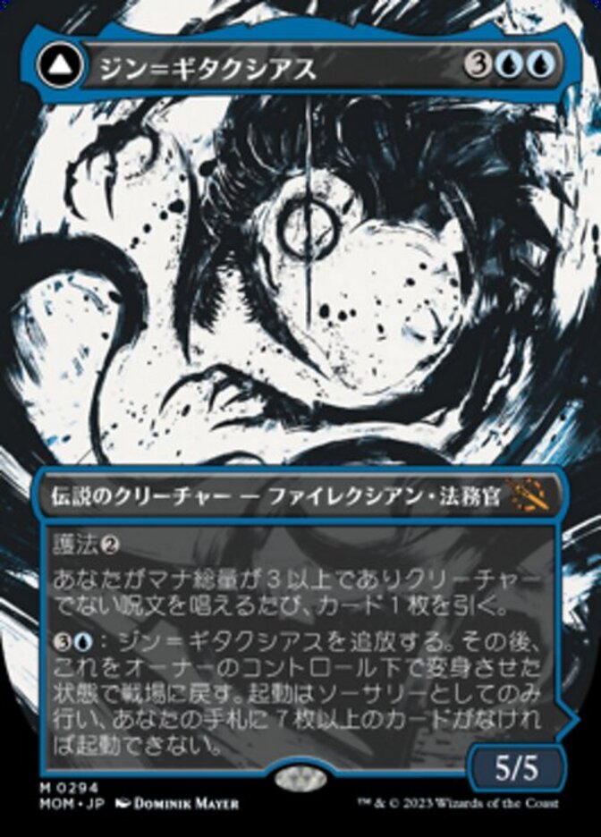 | Rules | Ward Whenever you cast a noncreature spell with mana value 3 or greater, draw a card. : Exile Jin-Gitaxias, then return it to the battlefield transformed under its owner's control. Activate only as a sorcery and only if you have seven or more cards in hand. // (As this saga enters and after your draw step, add a lore counter.) I — Draw cards equal to the number of cards in your hand. You have no maximum hand size for as long as you control The Great Synthesis. II — Return all non-Phyrexian creatures to their owners' hands. III — You may cast any number of spells from your hand without paying their mana costs. Exile The Great Synthesis, then return it to the battlefield (front face up). |
