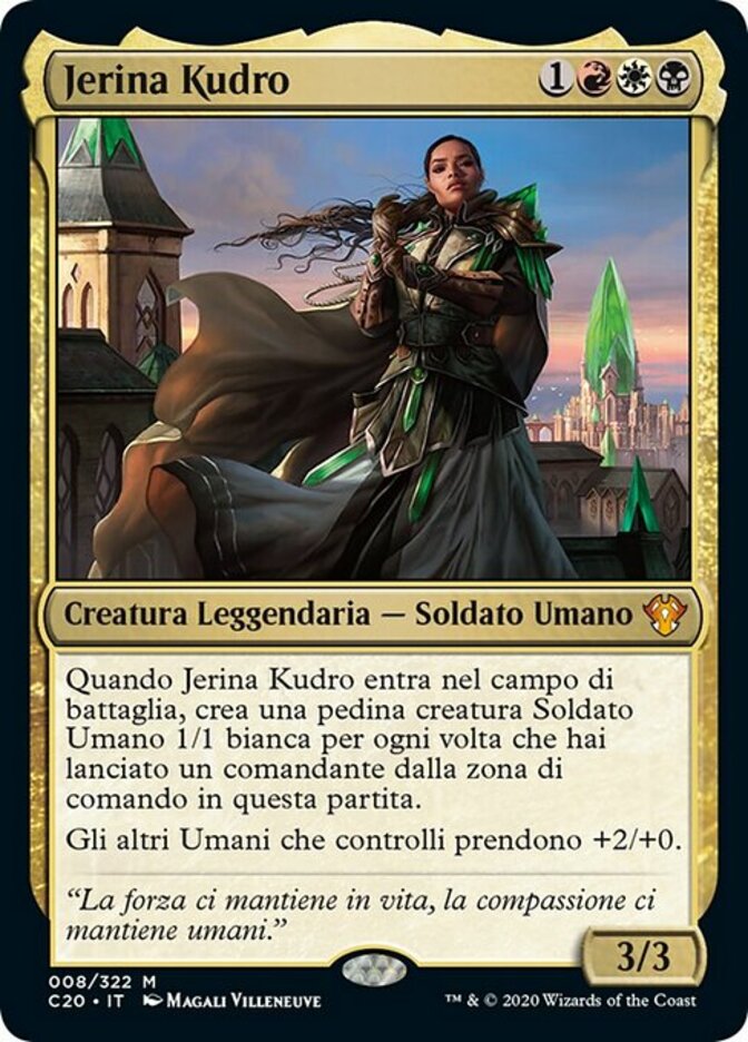 | Rules | When Jirina Kudro enters the battlefield, create a 1/1 white Human Soldier creature token for each time you've cast a commander from the command zone this game. Other Humans you control get +2/+0. |