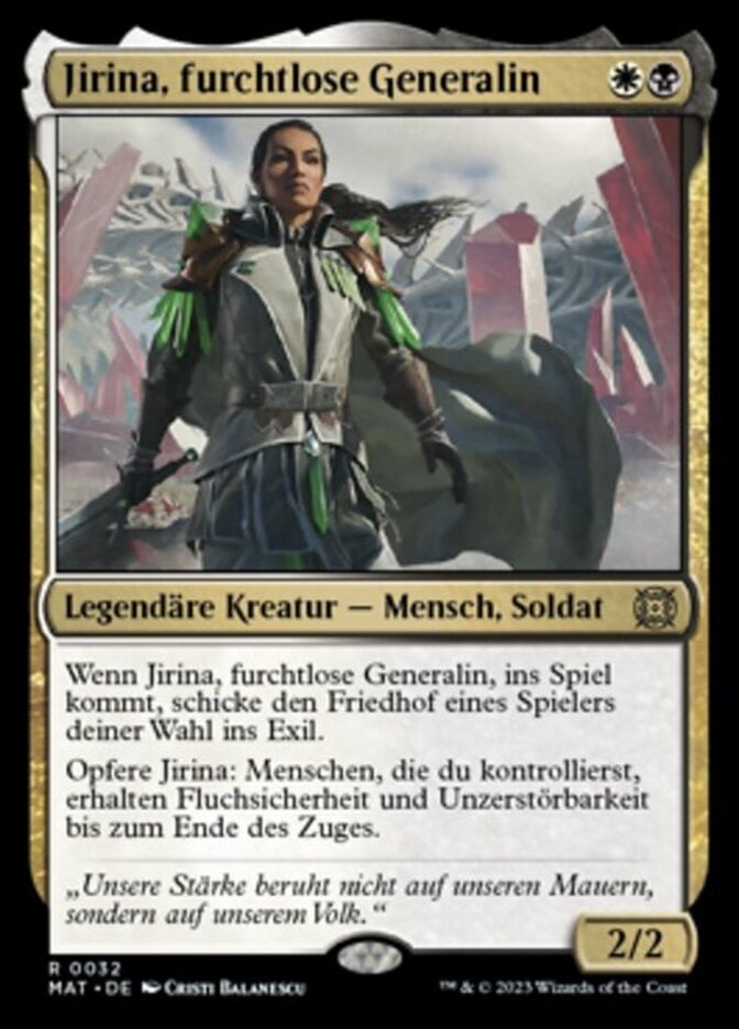 | Rules | When Jirina, Dauntless General enters the battlefield, exile target player's graveyard. Sacrifice Jirina: Humans you control gain hexproof and indestructible until end of turn. |