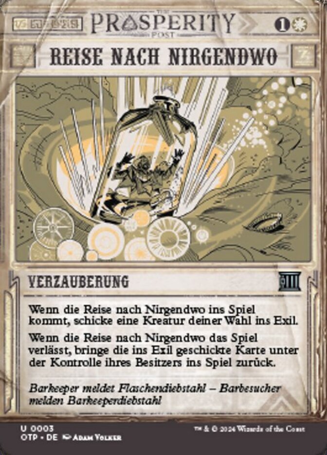 | Rules | When Journey to Nowhere enters the battlefield, exile target creature. When Journey to Nowhere leaves the battlefield, return the exiled card to the battlefield under its owner's control. |