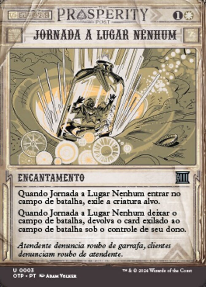 | Rules | When Journey to Nowhere enters the battlefield, exile target creature. When Journey to Nowhere leaves the battlefield, return the exiled card to the battlefield under its owner's control. |