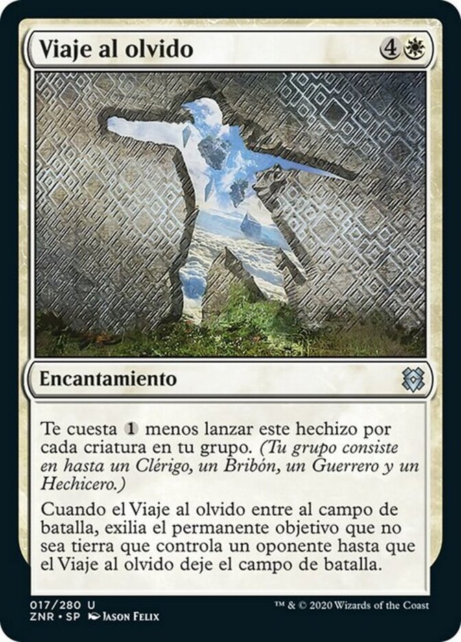 | Rules | This spell costs less to cast for each creature in your party. (Your party consists of up to one each of Cleric, Rogue, Warrior, and Wizard.) When Journey to Oblivion enters the battlefield, exile target nonland permanent an opponent controls until Journey to Oblivion leaves the battlefield. |