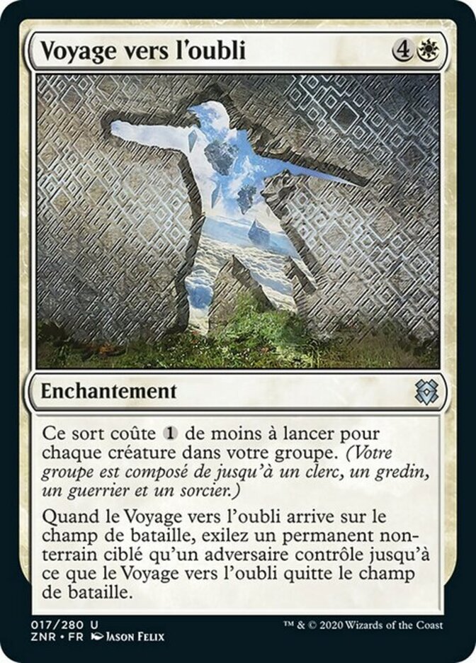 | Rules | This spell costs less to cast for each creature in your party. (Your party consists of up to one each of Cleric, Rogue, Warrior, and Wizard.) When Journey to Oblivion enters the battlefield, exile target nonland permanent an opponent controls until Journey to Oblivion leaves the battlefield. |