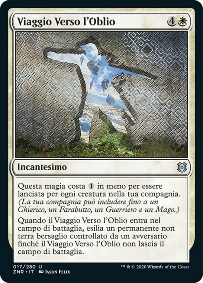 | Rules | This spell costs less to cast for each creature in your party. (Your party consists of up to one each of Cleric, Rogue, Warrior, and Wizard.) When Journey to Oblivion enters the battlefield, exile target nonland permanent an opponent controls until Journey to Oblivion leaves the battlefield. |