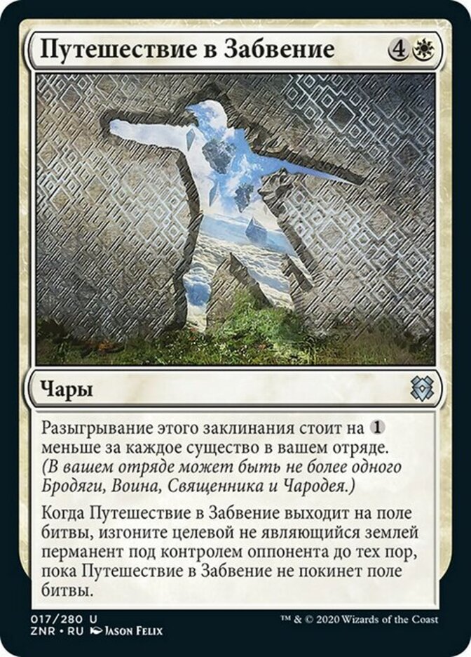 | Rules | This spell costs less to cast for each creature in your party. (Your party consists of up to one each of Cleric, Rogue, Warrior, and Wizard.) When Journey to Oblivion enters the battlefield, exile target nonland permanent an opponent controls until Journey to Oblivion leaves the battlefield. |