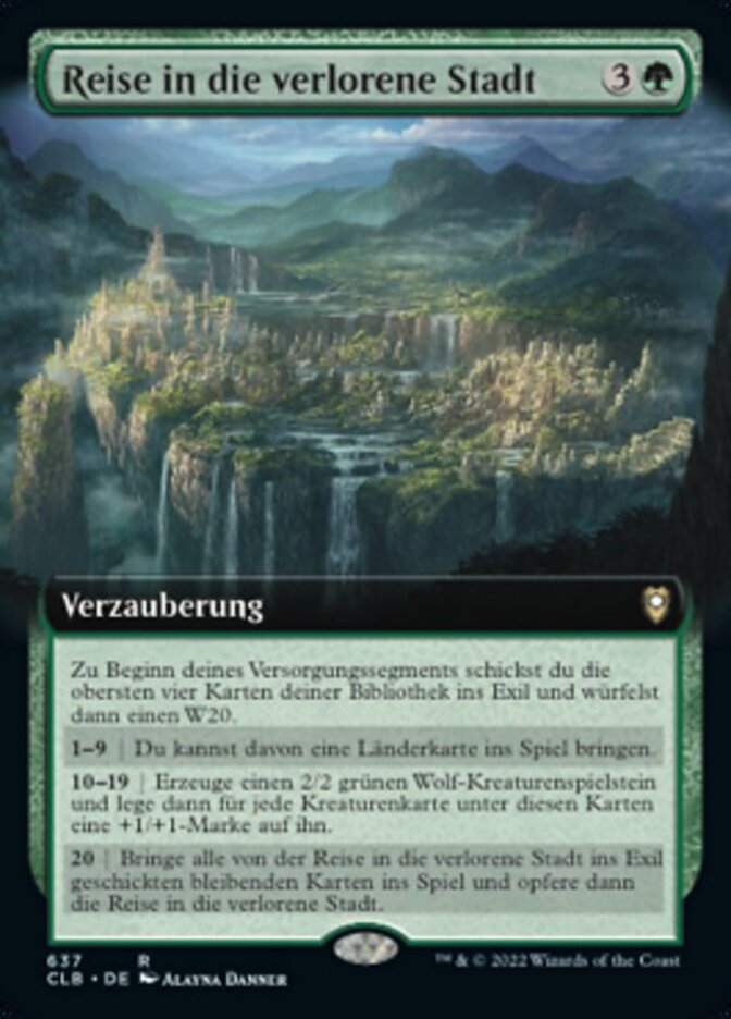 | Rules | At the beginning of your upkeep, exile the top four cards of your library, then roll a d20. 1-9 | You may put a land card from among those cards onto the battlefield. 10-19 | Create a 2/2 green Wolf creature token, then put a +1/+1 counter on it for each creature card among those cards. 20 | Put all permanent cards exiled with Journey to the Lost City onto the battlefield, then sacrifice it. |