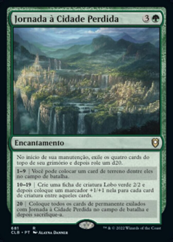 | Rules | At the beginning of your upkeep, exile the top four cards of your library, then roll a d20. 1-9 | You may put a land card from among those cards onto the battlefield. 10-19 | Create a 2/2 green Wolf creature token, then put a +1/+1 counter on it for each creature card among those cards. 20 | Put all permanent cards exiled with Journey to the Lost City onto the battlefield, then sacrifice it. |