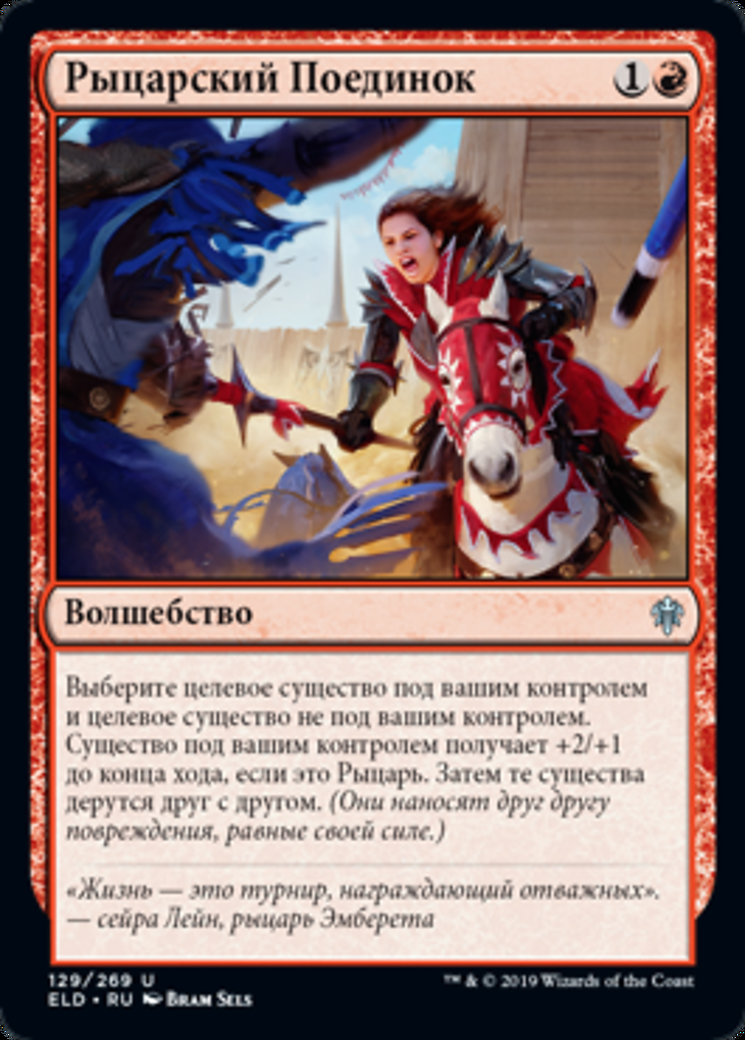 | Rules | Choose target creature you control and target creature you don't control. The creature you control gets +2/+1 until end of turn if it's a Knight. Then those creatures fight each other. (Each deals damage equal to its power to the other.) |