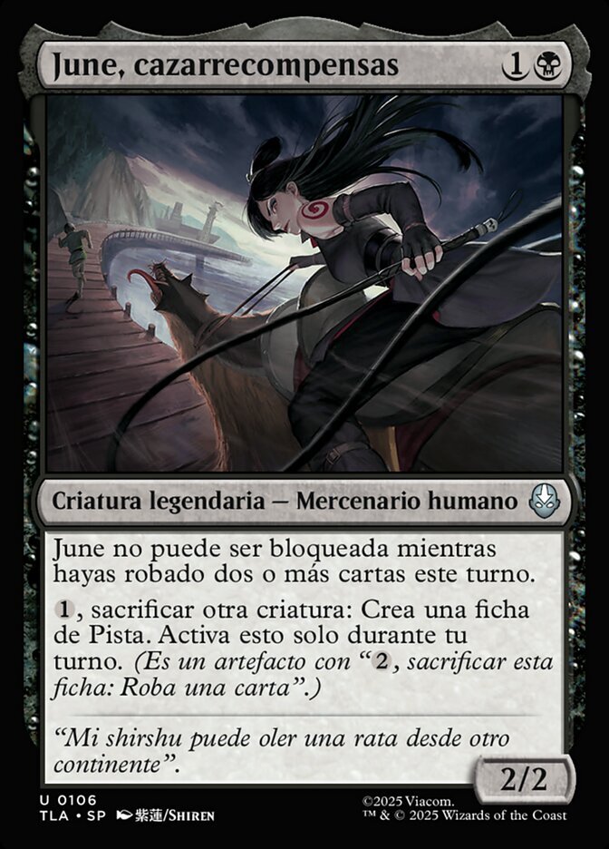 | Rules | June can't be blocked as long as you've drawn two or more cards this turn. , Sacrifice another creature: Create a Clue token. Activate only during your turn. (It's an artifact with ", Sacrifice this token: Draw a card.") |
