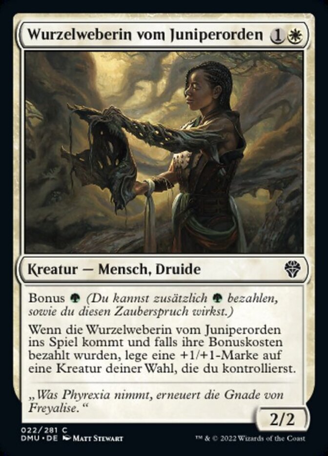 | Rules | Kicker (You may pay an additional as you cast this spell.) When Juniper Order Rootweaver enters the battlefield, if it was kicked, put a +1/+1 counter on target creature you control. |