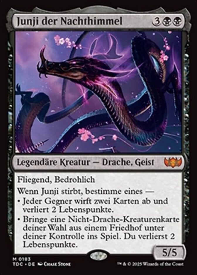 | Rules | Flying, menace When Junji, the Midnight Sky dies, choose one — • Each opponent discards two cards and loses 2 life. • Put target non-Dragon creature card from a graveyard onto the battlefield under your control. You lose 2 life. |
