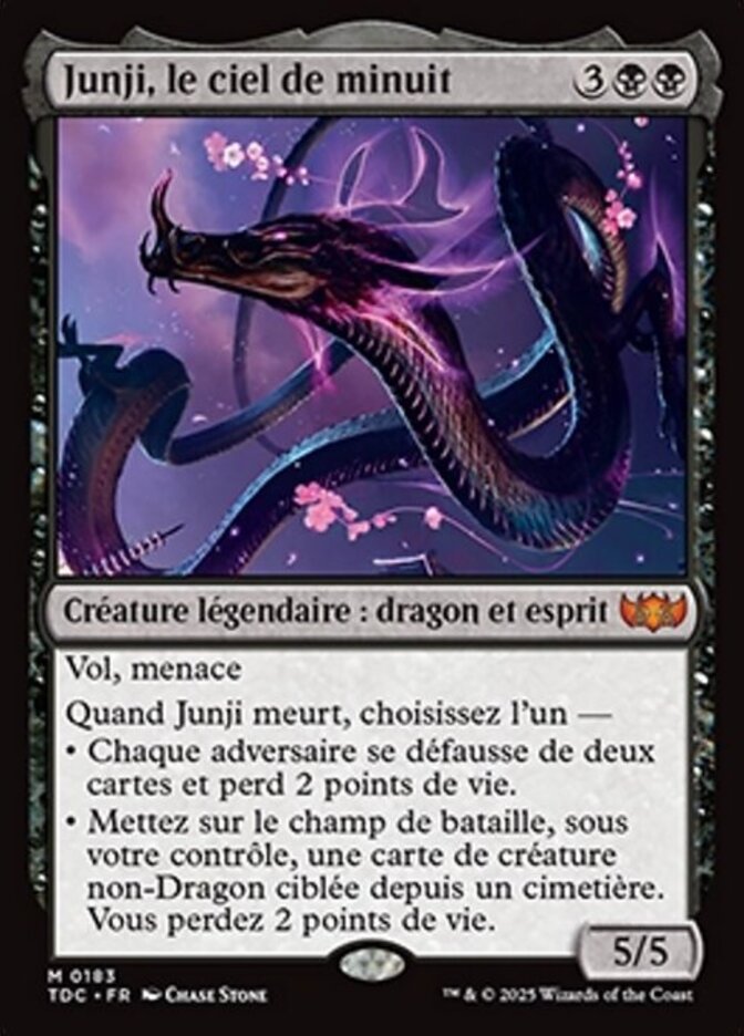 | Rules | Flying, menace When Junji, the Midnight Sky dies, choose one — • Each opponent discards two cards and loses 2 life. • Put target non-Dragon creature card from a graveyard onto the battlefield under your control. You lose 2 life. |