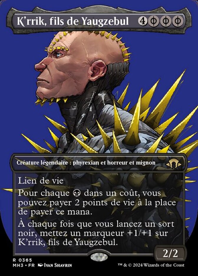 | Rules | ( can be paid with either or 2 life.) Lifelink For each in a cost, you may pay 2 life rather than pay that mana. Whenever you cast a black spell, put a +1/+1 counter on K'rrik, Son of Yawgmoth. |