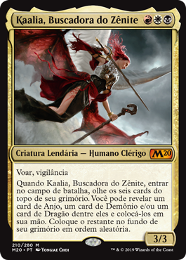 | Rules | Flying, vigilance When Kaalia, Zenith Seeker enters the battlefield, look at the top six cards of your library. You may reveal an Angel card, a Demon card, and/or a Dragon card from among them and put them into your hand. Put the rest on the bottom of your library in a random order. |