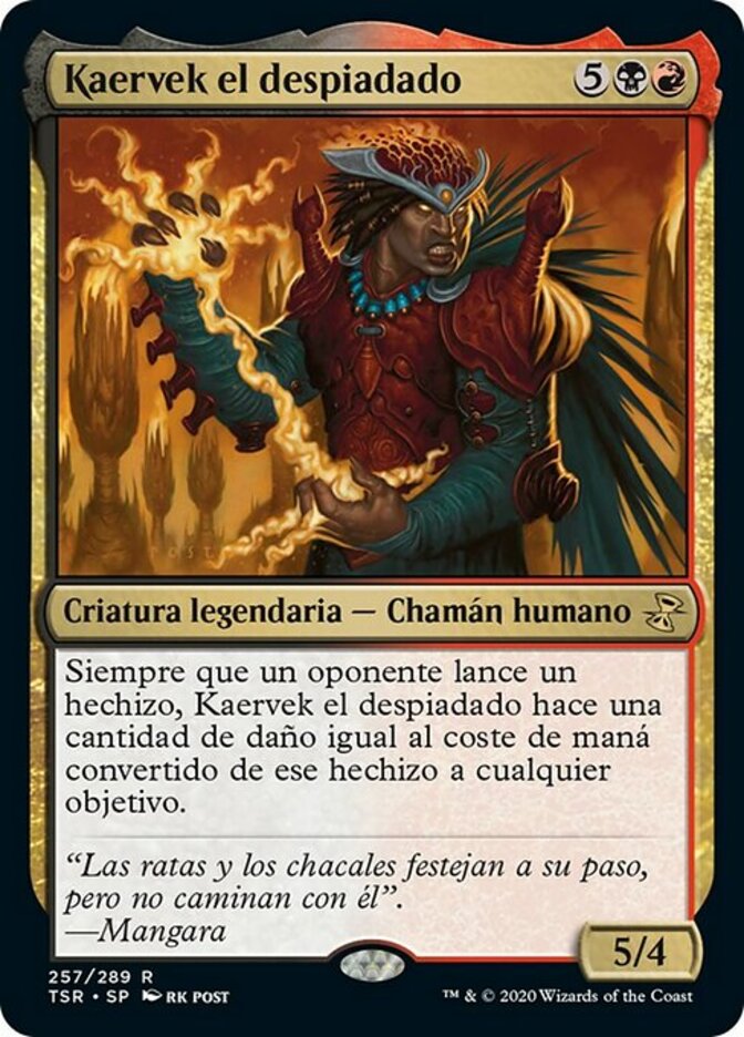 | Rules | Whenever an opponent casts a spell, Kaervek the Merciless deals damage equal to that spell's mana value to any target. |