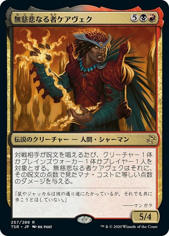 | Rules | Whenever an opponent casts a spell, Kaervek the Merciless deals damage equal to that spell's mana value to any target. |