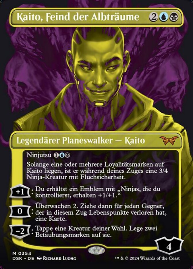 | Rules | Ninjutsu (, Return an unblocked attacker you control to hand: Put this card onto the battlefield from your hand tapped and attacking.) During your turn, as long as Kaito has one or more loyalty counters on him, he's a 3/4 Ninja creature and has hexproof. +1: You get an emblem with "Ninjas you control get +1/+1." 0: Surveil 2. Then draw a card for each opponent who lost life this turn. −2: Tap target creature. Put two stun counters on it. |