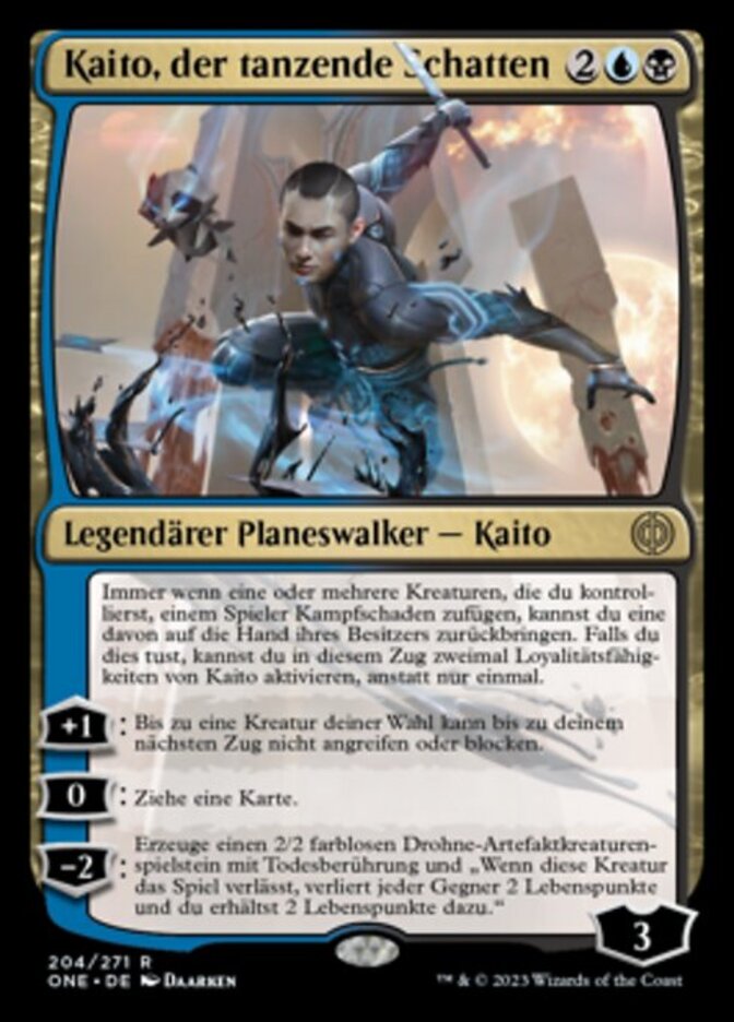 | Rules | Whenever one or more creatures you control deal combat damage to a player, you may return one of them to its owner's hand. If you do, you may activate loyalty abilities of Kaito twice this turn rather than only once. +1: Up to one target creature can't attack or block until your next turn. 0: Draw a card. −2: Create a 2/2 colorless Drone artifact creature token with deathtouch and "When this creature leaves the battlefield, each opponent loses 2 life and you gain 2 life." |