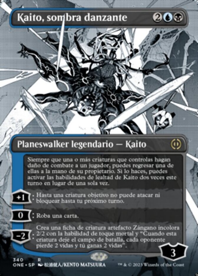 | Rules | Whenever one or more creatures you control deal combat damage to a player, you may return one of them to its owner's hand. If you do, you may activate loyalty abilities of Kaito twice this turn rather than only once. +1: Up to one target creature can't attack or block until your next turn. 0: Draw a card. −2: Create a 2/2 colorless Drone artifact creature token with deathtouch and "When this creature leaves the battlefield, each opponent loses 2 life and you gain 2 life." |