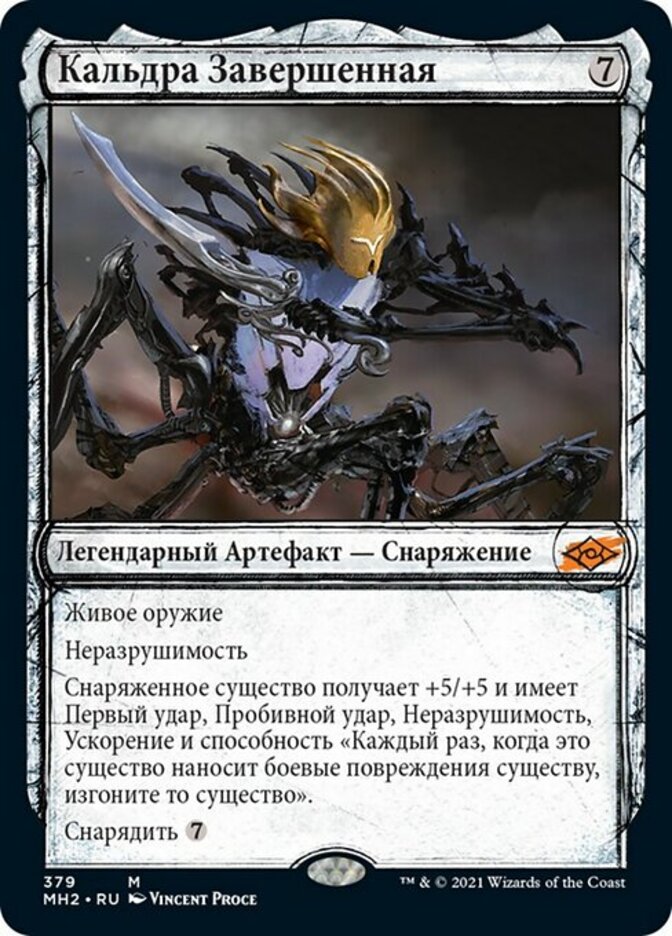 | Rules | Living weapon Indestructible Equipped creature gets +5/+5 and has first strike, trample, indestructible, haste, and "Whenever this creature deals combat damage to a creature, exile that creature." Equip |