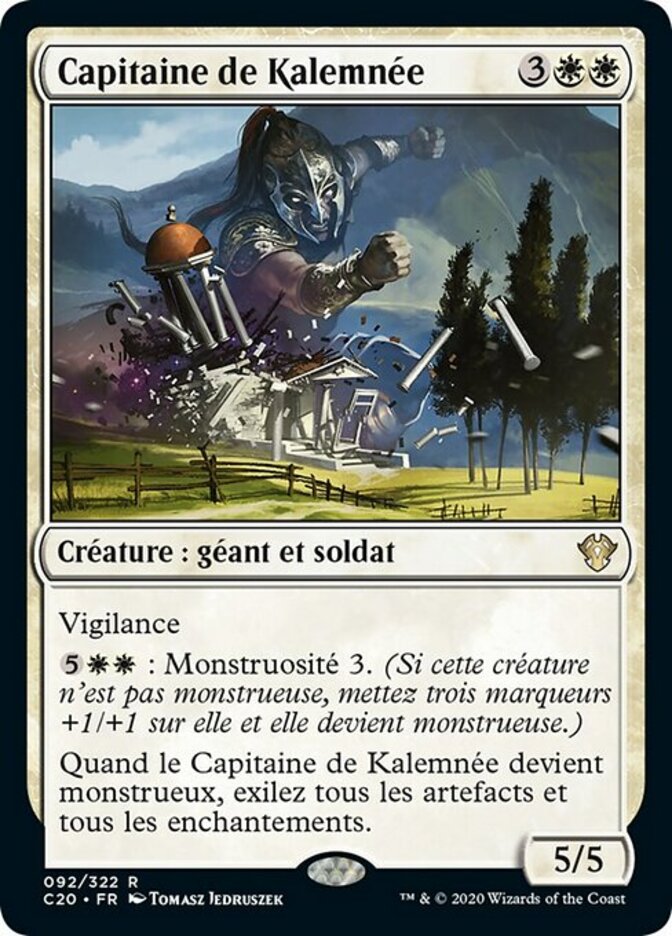 | Rules | Vigilance : Monstrosity 3. (If this creature isn't monstrous, put three +1/+1 counters on it and it becomes monstrous.) When Kalemne's Captain becomes monstrous, exile all artifacts and enchantments. |