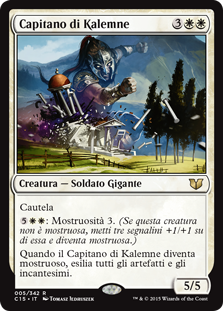 | Rules | Vigilance : Monstrosity 3. (If this creature isn't monstrous, put three +1/+1 counters on it and it becomes monstrous.) When Kalemne's Captain becomes monstrous, exile all artifacts and enchantments. |